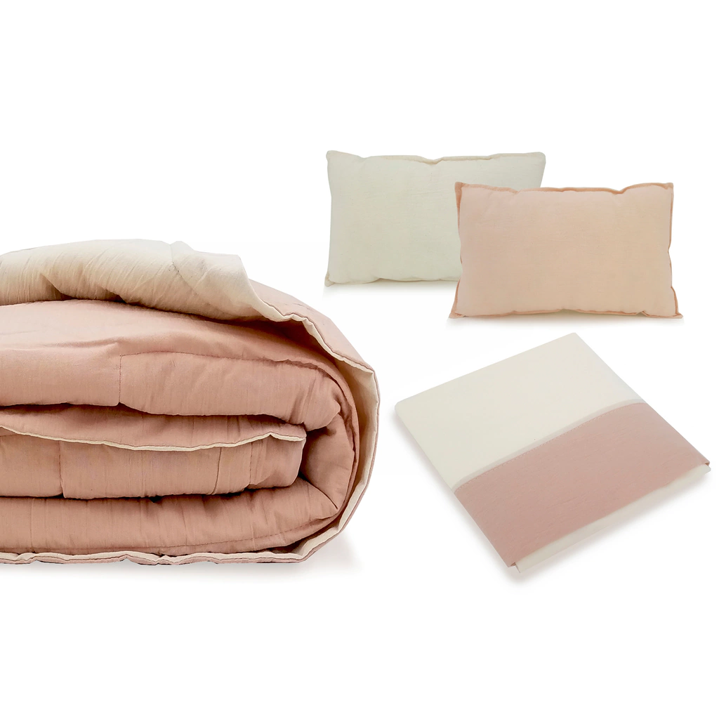 sabanas + acolchado reversible + muñeco de apego + almohadon rectangular